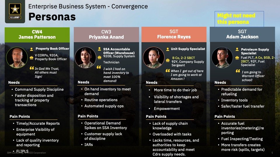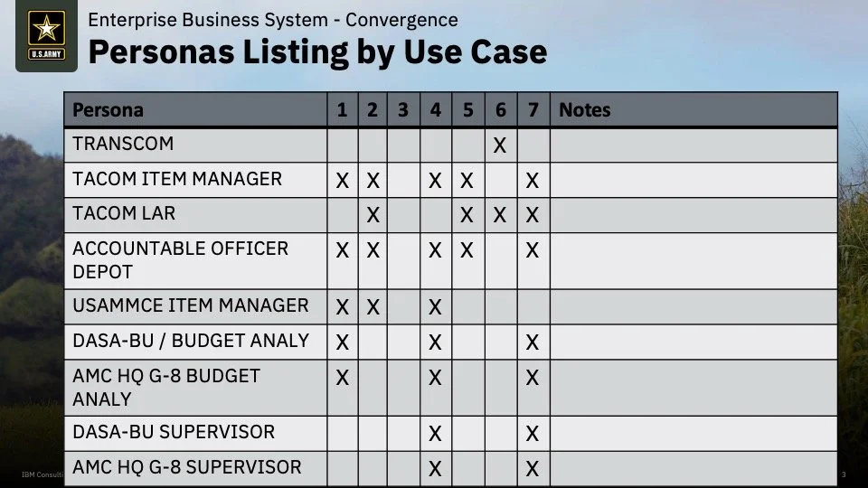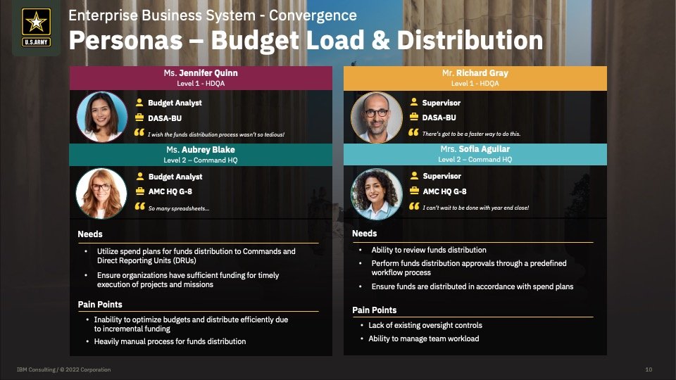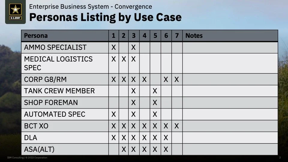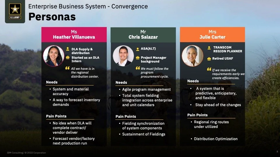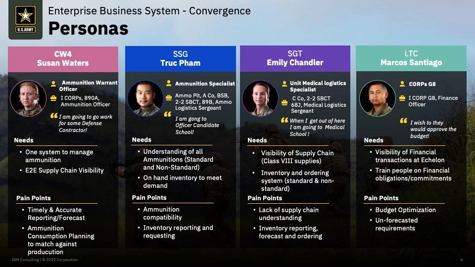 When I inherited the personas from the previous team, I took the time to review them and ensure they were still relevant to our current design process. While the personas themselves were well-developed and provided valuable insights into our users, the Army’s processes had changed since their creation, which meant that their placement and context within our current designs needed to be carefully considered.